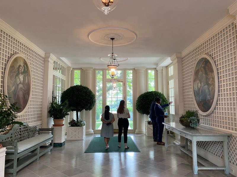 Addition of beautiful marble flooring, wall decor and overhead lighting - looks like chandeliers - Nice Job!