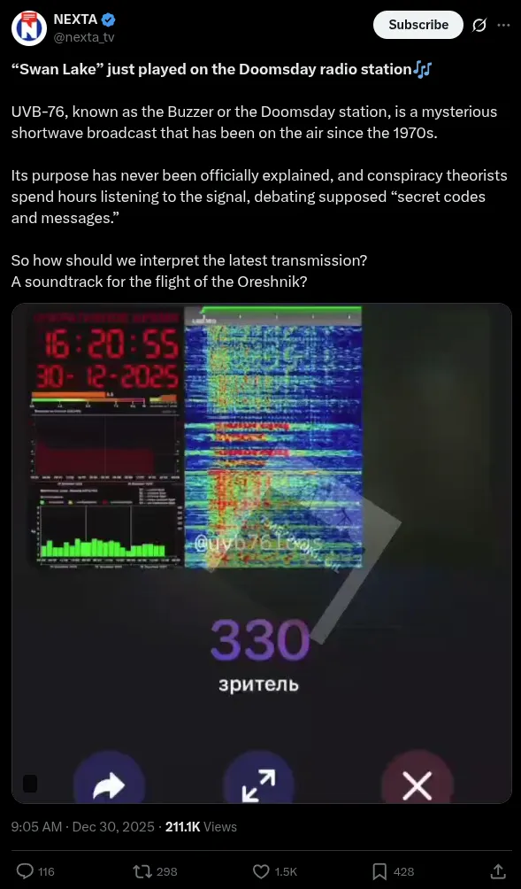 "X users are reporting that a mysterious Russian shortwave radio signal, nicknamed "The Buzzer" and informally known as the "doomsday radio station," that has been continuously broadcasting since the late 1970s, has just transmitted the classical piece Swan Lake by Pyotr Ilyich Tchaikovsky.