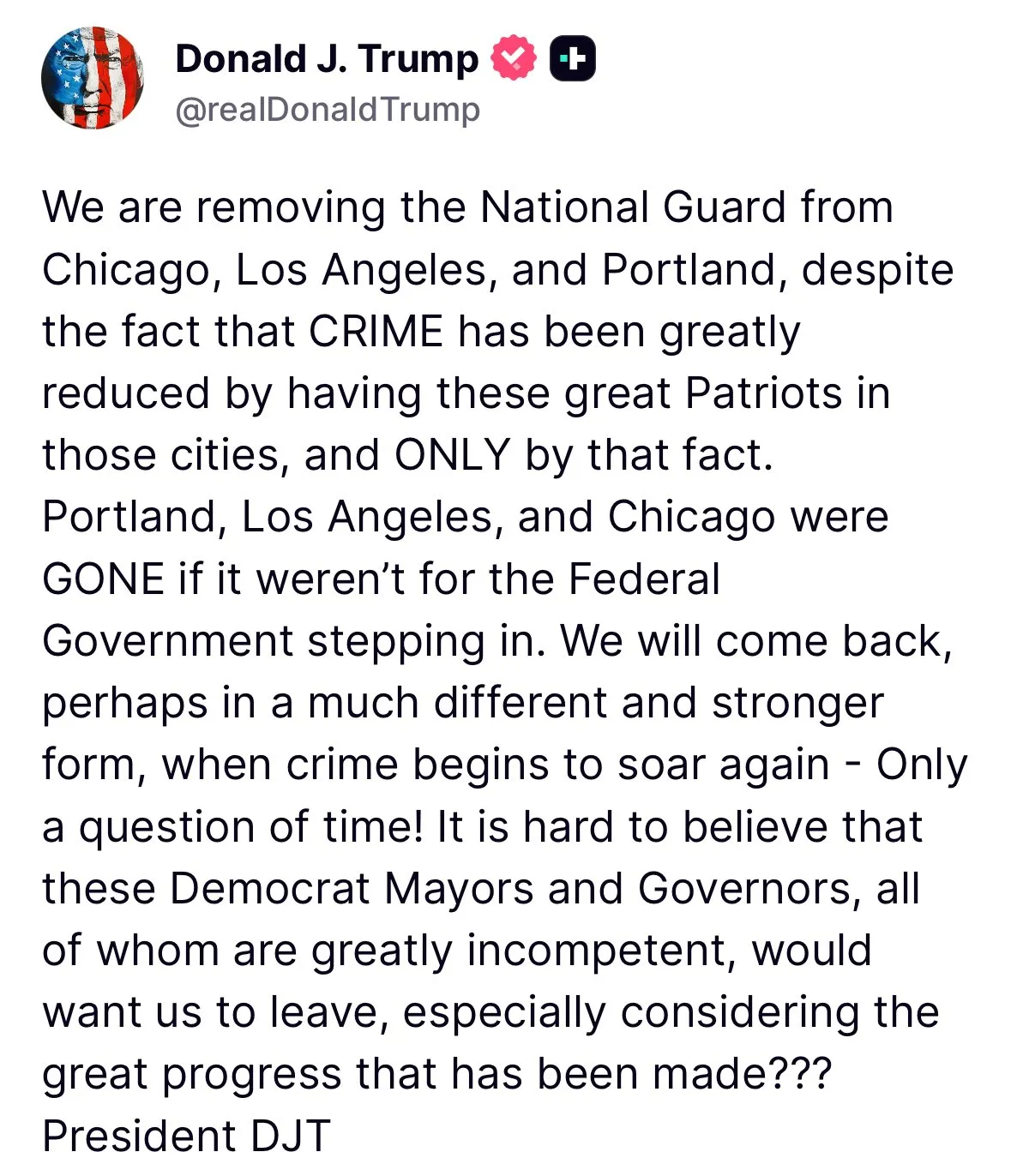🔥HOLY SH*T🔥 Trump just said he is removing the National Guard from Chicago, LA, and Portland, but says “we will come back, perhaps in a much different and stronger form”.