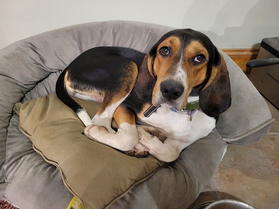Howard has a sore foot, probably from too much rough play with #1 Marine Daughter's doberman yesterday, so he's feeling a bit sorry for himself this morning. House training is going very well. He's completely figured out that he needs to ring the jingle bells on the doorknob to go out for a potty break. He's even started knocking on the door to come back in when he's finished. We don't always hear it when he does that so we're going to hang bells on the exterior door knobs just as soon as I find a minute to stop at the dollar store.