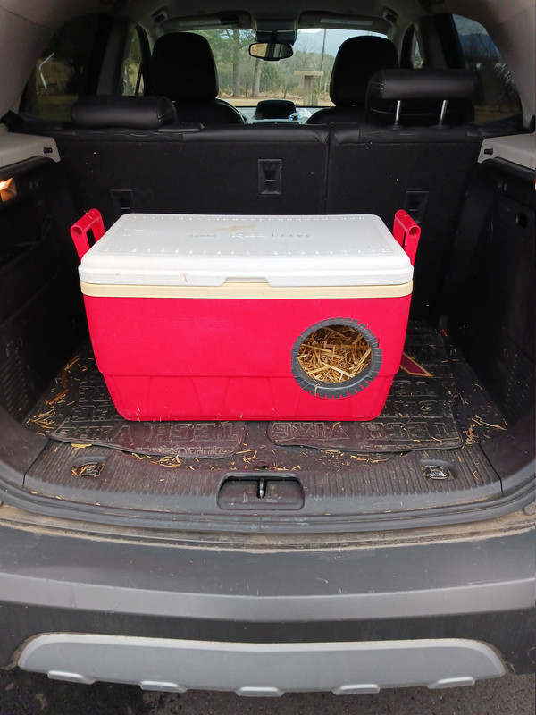 A lot of houses you can buy have that 2nd escape door. Many of the feral cat shelters made out of bins only have one. This cooler isn’t big enough for 2 holes. If he absolutely refuses to use it, we’ll have to try something bigger for a 2nd hole. The Igloo is located up on a front porch so it’s a sheltered spot & no problems with animals coming up on the porch to get his food so maybe the one hole will work - fingers crossed.