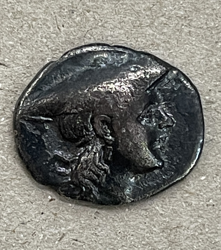 One of mine, a silver Greek coin from about 350 BC. The silver has toned to a blue/green with golden highlights. Hard to capture in photos. It's been this way on my family for about 60 years, so it might have taken centuries to get this look. I'd never ever even consider cleaning that off.