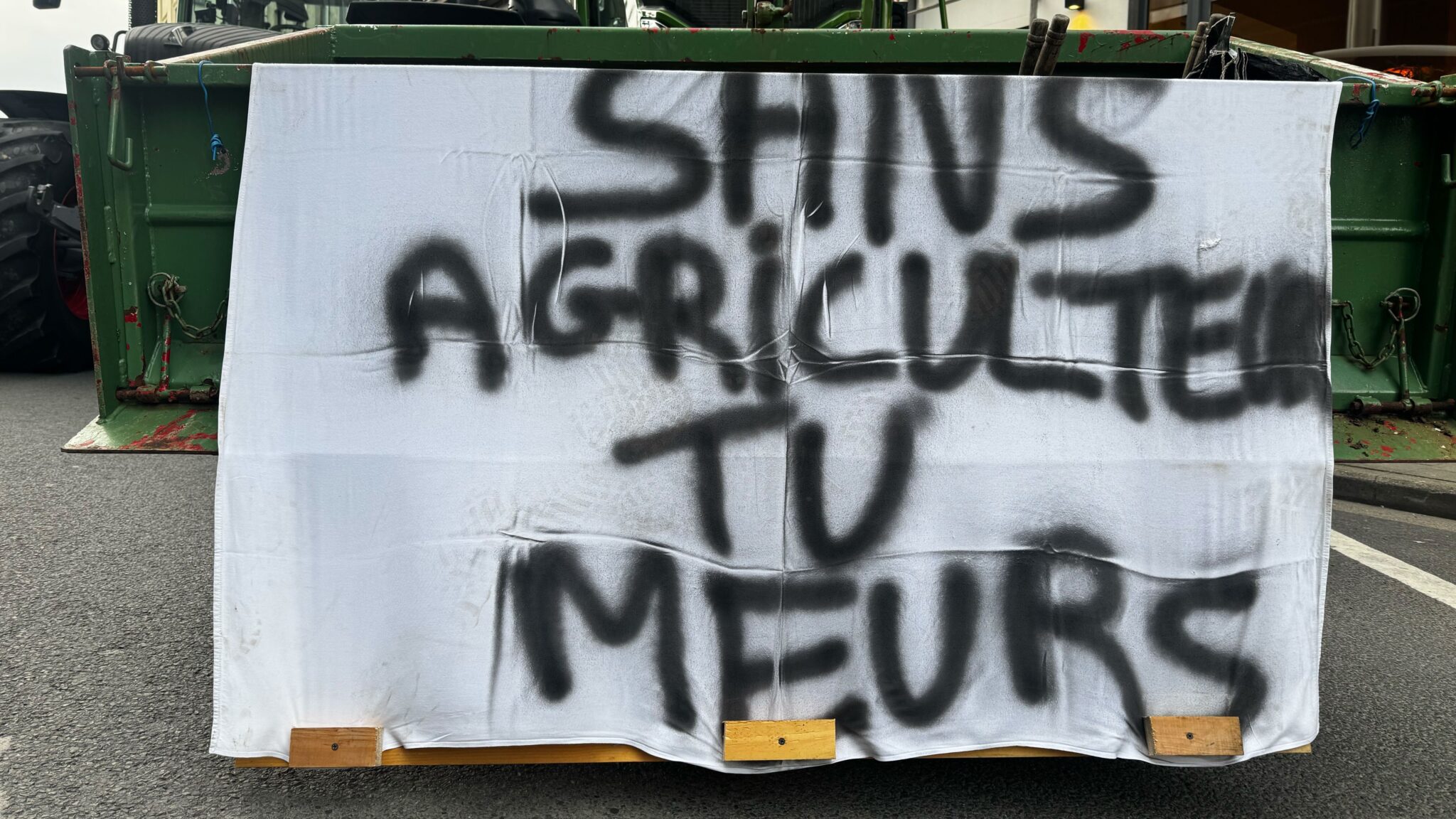 A placard on a tractor that reads “Without agriculture you die” seen during a farmers’ protest in Brussels, Belgium on December 18, 2025 - Javier Villamor / europeanconservative.com.