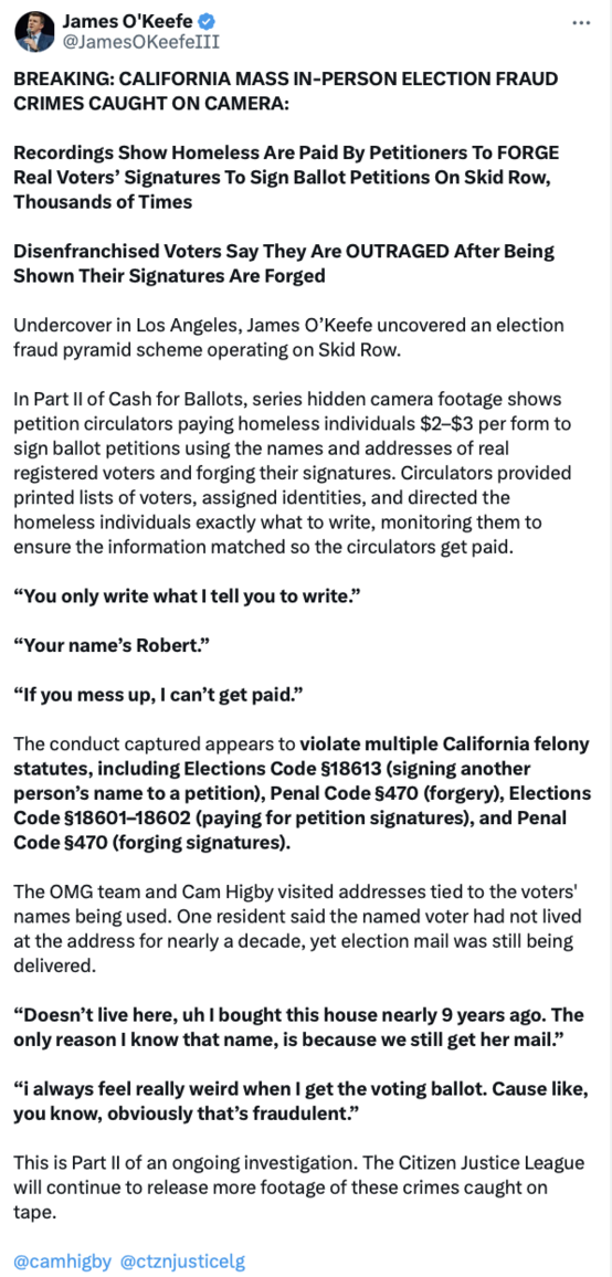 BREAKING: California Election Fraud Crimes Caught on Camera: Homeless People Paid by Petitioners to Forge Real Voters’ Signatures to Sign Ballot Petitions