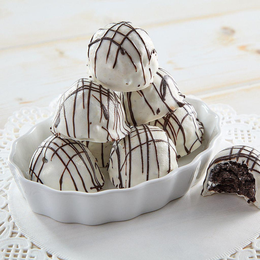 Method Cream softened cream cheese, add finely blendered Oreos. Roll into 1-inch balls; chill well. Dip into melted almond bark using two forks. Let set on wax paper-covered cookie sheet. Garnish w/ drizzle of melted chocolate.