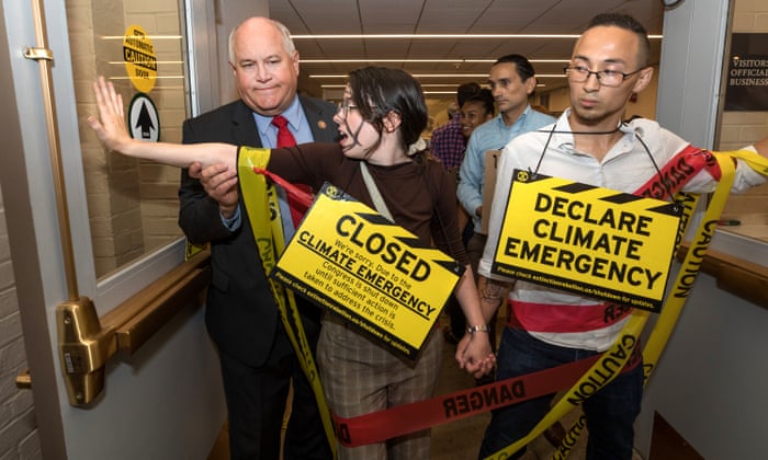 A few members of Congress arrived and, finding their route blocked, were forced to turn around. But other people, including fellow activists, gathered under the Cannon building rotunda to watch. The demonstrators shouted, “Climate emergency now!”, “We’re out of time!” and “This is not a drill!”