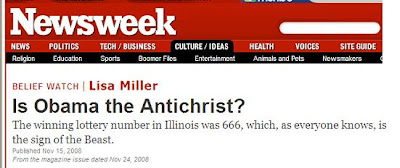 On Nov. 5, Todd Strandberg was at his desk, fielding E-mails from around the world. As the editor and founder of RaptureReady.com, his job is to track current events and link them to biblical prophecy in hopes of maintaining his status as "the eBay of prophecy," the best source online for predictions and calculations concerning the end of the world. Already Barack Obama had drawn the attention of apocalypse watchers after an anonymous e-mail circulated among conservative Christians in October implying that he was the Antichrist. Former "Saturday Night Live" ingénue Victoria Jackson fueled the fire when, according to news reports, she wrote on her Web site that Obama "bears traits that resemble the anti-Christ." Now Strandberg was receiving up-to-the-minute news from his constituents in Illinois. One of the winning lottery numbers in the president-elect's home state was 666 which, as everyone knows, is the sign of the Beast (also known as the Antichrist). "It is very eerie, and I take it for a sign as to who he really is," wrote one of Strandberg's correspondents...Understandably, the Left was not amused by this report.