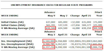 In the week ending May 9, the advance figure for seasonally adjusted initial claims was 637,000, an increase of 32,000 from the previous week's revised figure of 605,000. The 4-week moving average was 630,500, an increase of 6,000 from the previous week's revised average of 624,500.