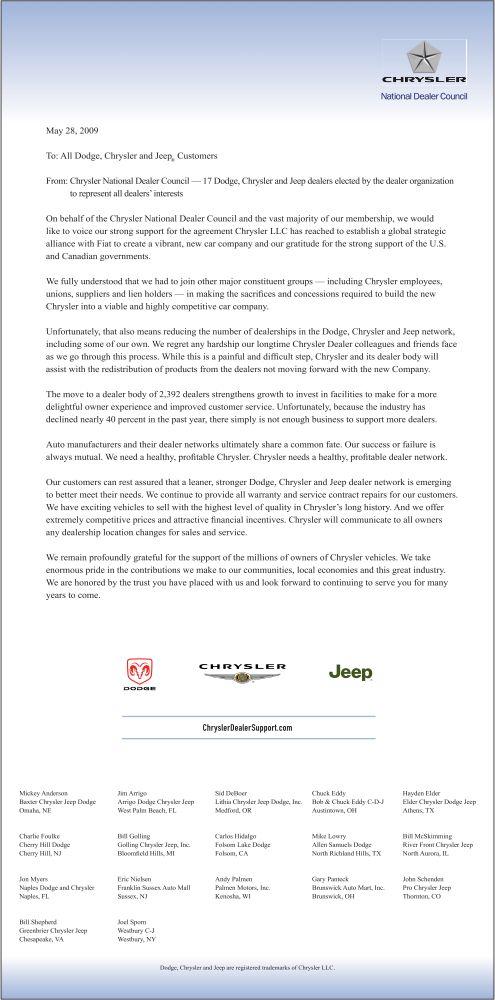 Our customers can rest assured that a leaner, stronger Dodge, Chrysler and Jeep dealer network is emerging to better meet their needs....I'm with you, kitty! I made my final payment on my Dodge truck this week! And I just received in the mail an invitiation from my dealer to an event to announce the building of a 'New Car Company' (Chrysler) and to show their appreciation with incentives.We remain profoundly grateful for the support of the millions of owners of Chrysler vehicles. We take enormous pride in the contributions we make to our communitites, local economies and this great industry. We are honored by the trust you have placed with us and look forward to continuing to serve your for many years to come.