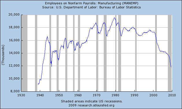 There was an interesting article posted yesterday? that pointed out jobs by sector is not a zero-sum game, that when you do historical comparison back to before there was such a thing as a service sector (as we know it today), the rise in these new sectors will cause the percentage of the older ones to go down. True we’re not building schlock anymore but the manufacturing sector is going great guns, present Obamacession discounted. IOW, it isn’t a disaster.