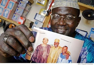 Malik Obama, older brother to Barack Obama, holds an undated picture of Barak, left, and himself, middle, and an unidentified friend in his shop in eastern Kenya. (Karel Prinsloo, AP)