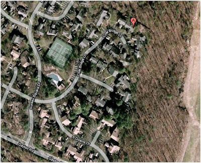 Furthermore, his property lies at the outer perimeter of the development, which borders a large tract of open land. Visible by satellite, again using Google, you can see an adjacent area covered with brush, then a large open space, past which is a shopping or business development. So the opportunity to see his property is extremely minimal.