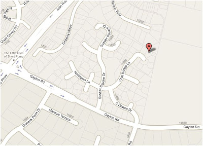 What the map does reveal, however, was a surprise: Barfoots property is situated in a cul-de-sac at the end of a winding lane. The only way to get there is to turn off the main street (Gayton Road), enter the cloistered neighborhood, turn off Sussex Square Drive onto Coat Bridge Lane, and follow that street around a final curve to a dead end. In other words, only a few close neighbors in his association can actually see his house. Unless you live next door to him, you would have to go out of your way to see the flagpole (or the flag, which is what I believe this is really about).