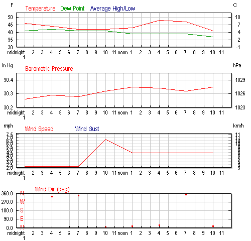 1:00 AM 46 °F 41 °F 77% 30.26 in 6 miles NE 2.2 mph - - Partly Cloudy 4:00 AM 44 °F 42 °F 88% 30.29 in 6 miles NNW 2.2 mph - - Mostly Cloudy 7:00 AM 42 °F 41 °F 94% 30.28 in 2 miles NNW 2.2 mph - - Light Rain Showers 10:00 AM 42 °F 41 °F 94% 30.32 in 12 miles North 6.7 mph - Partly Cloudy 1:00 PM 43 °F 39 °F 81% 30.35 in 12 miles NNE 4.5 mph - - Mostly Cloudy
