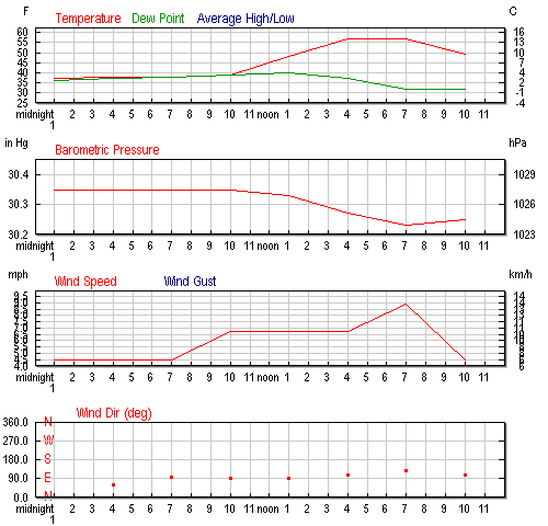 1:00 AM 37 °F 36 °F 92% 30.35 in 6 miles NE 4.5 mph - - Scattered Clouds 4:00 AM 38 °F 37 °F 94% 30.35 in 6 miles ENE 4.5 mph - - Overcast 7:00 AM 38 °F 38 °F 100% 30.35 in 0 miles East 4.5 mph - - Fog Heavy Fog 10:00 AM 39 °F 39 °F 100% 30.35 in 1 miles East 6.7 mph - - Mist 1:00 PM 48 °F 40 °F 64% 30.33 in 2 miles East 6.7 mph - - Clear