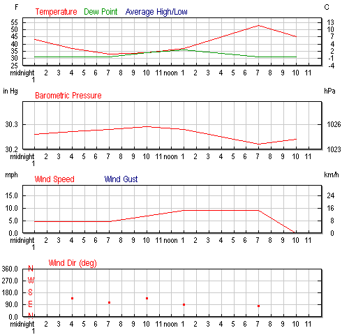 1:00 AM 43 °F 31 °F 52% 30.26 in 6 miles SE 4.5 mph - - Mostly Cloudy 4:00 AM 37 °F 31 °F 72% 30.27 in 6 miles SE 4.5 mph - - 7:00 AM 33 °F 31 °F 89% 30.28 in 2 miles ESE 4.5 mph - - Mist 10:00 AM 34 °F 34 °F 98% 30.29 in 0 miles SE 6.7 mph - - Fog Heavy Fog 1:00 PM 37 °F 36 °F 94% 30.28 in 2 miles East 8.9 mph - - Mist