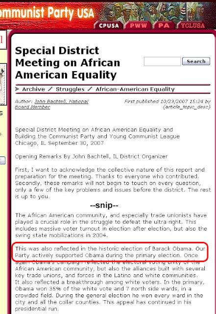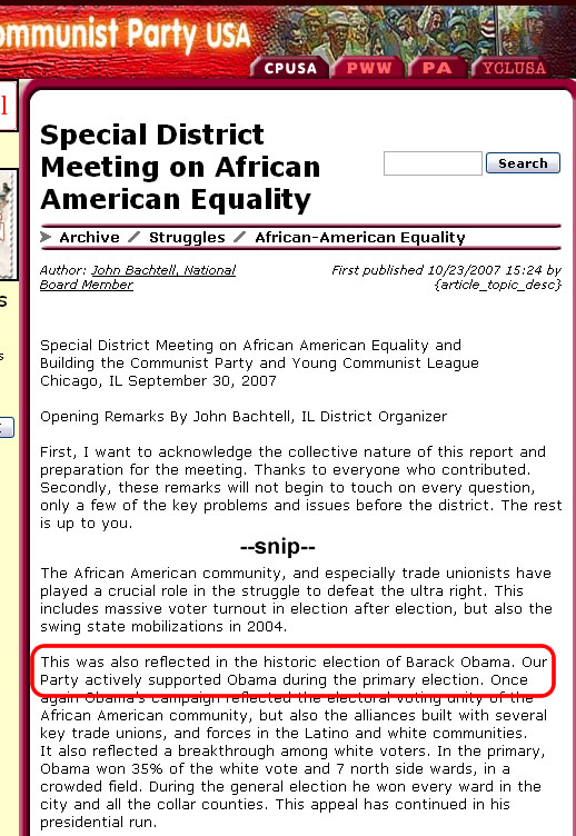Below is a screen shot of the original article, taken as it appeared on the Communist Party USA website as at December 30, 2007. Note the reference to Communist Party support for Obama in the 2004 U.S. Senate primaries.
