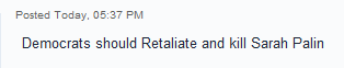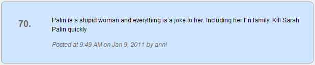 And no, there was not just one insane person on one insane website, but many cases of wackos calling for the death of Sarah Palin. Like this one from a commenter on TMZ: