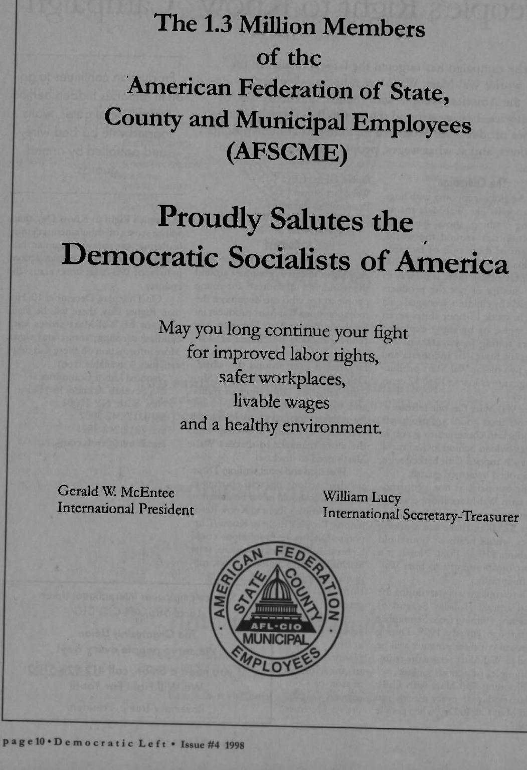 McEntee and Lucy, on behalf of AFCSE, placed an advertisement in D.S.A.'s Democratic Left, Issue #4 1998, page 10, "AFSCME proudly salutes Democratic Socialists of America".