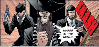 Notice, the decidedly Aryan features, almost the spitting image of the Nazi Superman. Of course you see that evil rabbi towering over a helpless infant and a woman,presumably the baby's mother being restrained. Then there's a closeup of the evil rabbi. Wow, that's one evil dude. Sadistic looking. I guess all that blather about circumcision being a spiritual ritual was just a pose to inflict pain and suffering on an innocent baby. Who knew? Could this be anymore brazenly anti semitic? Then there's the act itself: Don't you just love the way he bursts into the room with armed bodyguards beside him? Was the door locked? I never knew that breaking in doors was a prerequisite at a briss. Here you have a gross distortion. The evil rabbi invoking God to justify his dastardly deeds. Thank goodness our Aryan hero is nearby to save the day and the child.