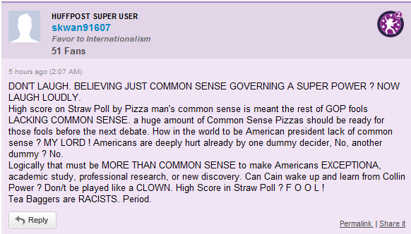 The reasoning for these liberals goes something like this: "Herman Cain is black. He won the Florida Republican Straw Poll. Therefore, Republicans are voting for him just to say they're not racist, but they'd never actually nominate him, even though they are voting for his nomination." It makes no sense to anyone that has a conscience, but then again, we must remember that liberals are making these arguments.