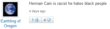 Herman Cain is racist against himself.Oh, my! I am just cracking up. The lunacy of the left knows no bounds.