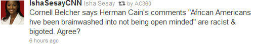 Earlier this week, Mr. Cain stated that African Americans are "brainwashed" towards voting for Democrats. Mr. Belcher quickly turned around and stated that those comments were "racist and bigoted:"