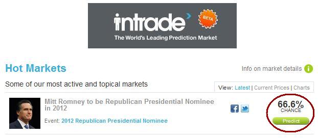 Intrade? Who cares. Is there any real track record of it’s in inevitability considering it can be bought? What keeps a campaign from shoveling money onto their candidate to prop them up against what current state by state polling says?