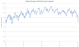 There are a couple of indicators coming from the energy sector which show signs the economy is turning over and not turning around. Usually, when the economy is hitting on all cylinders, more energy is consumed. We use more gasoline and consume more electric power. That doesn't seem to be the case right now as you can see from this graph of data from the Energy Information Administration (EIA) of retail gasoline supplied: