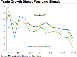 And finally, Morgan Stanley recently published a chart which showed that South Korea, Taiwan and China are all reporting a fall in exports compared to the previous year. Much of this is probably related to weakness in Europe but as we are all interconnected, it surely isn't a great sign since these countries also supply the items that we buy: