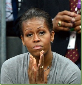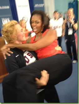 She may like to have her photo ops with the athletes but only because she can then capitalize on her stupid, fake “Get up and move” campaign.