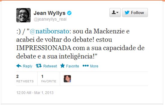 (Twitter) From a Mackenzie student to Jean Wyllys: I am of Mackenzie e I just came from the debate! I am IMPRESSED by your ability to debate and your intelligence.