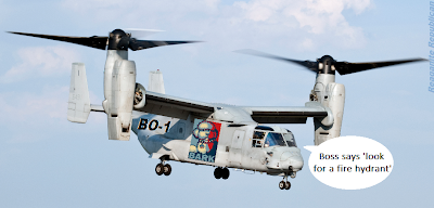 For any not familiar with the V-22 Osprey of the US Marine Corps, the innovative hybrid plane (Bell/Boeing development inspired by Jimmy Carter's 1980 disaster-in-the-desert) can take-off with a heavy payload vertically (2x largest 'copter/24 troops), then turn the wings slowly forward and fly like a conventional prop plane.
