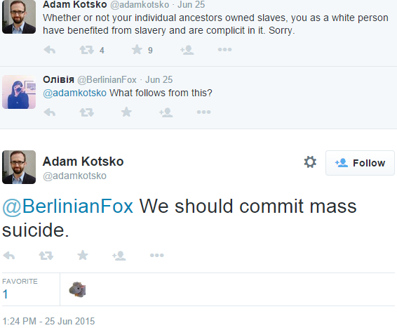 Every single white person alive today is "complicit" in slavery, according to Assistant Professor of Humanities Adam Kotsko, and should kill themselves. Dr. Kotsko teaches at Shimer College in Chicago.