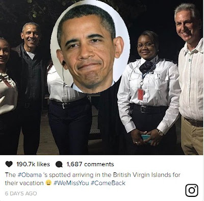 When the Lame Cherry exposed the reality that the image of Barack Hussein Obama did not get on the Virgin Islands vacation plane, and only Lurch the wife, Muchelle did, I wondered how long it would be, before the image was put before the public again, because when the prototypes have been put into storage, it disrupts the operation and forces those minders to produce an image, - because people noticed what the Lame Cherry said, - and started asking questions.