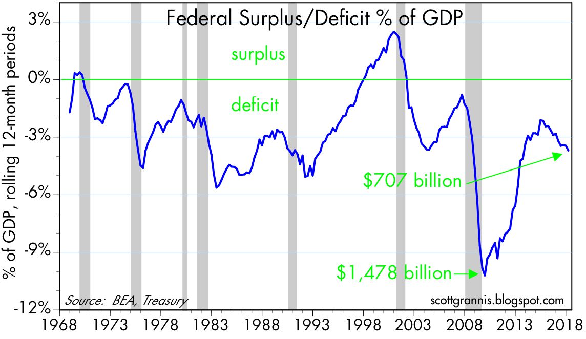 As Chart #2 shows, spending has been rising at a fairly constant rate (about 4% per year) since 2015. On a rolling 12-mo. basis, federal revenue has risen at a 3.4% rate over what it was a year ago, and it could easily be recording 5-6% rates of growth going forward. With just the tiniest bit of spending restraint, we could see the budget deficit hold steady or decline between now and year end.