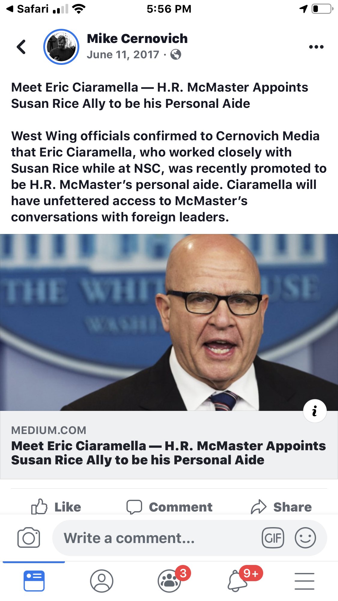 4. "in June 2017, Eric Ciaramella became Executive Assistant of General McMaster"