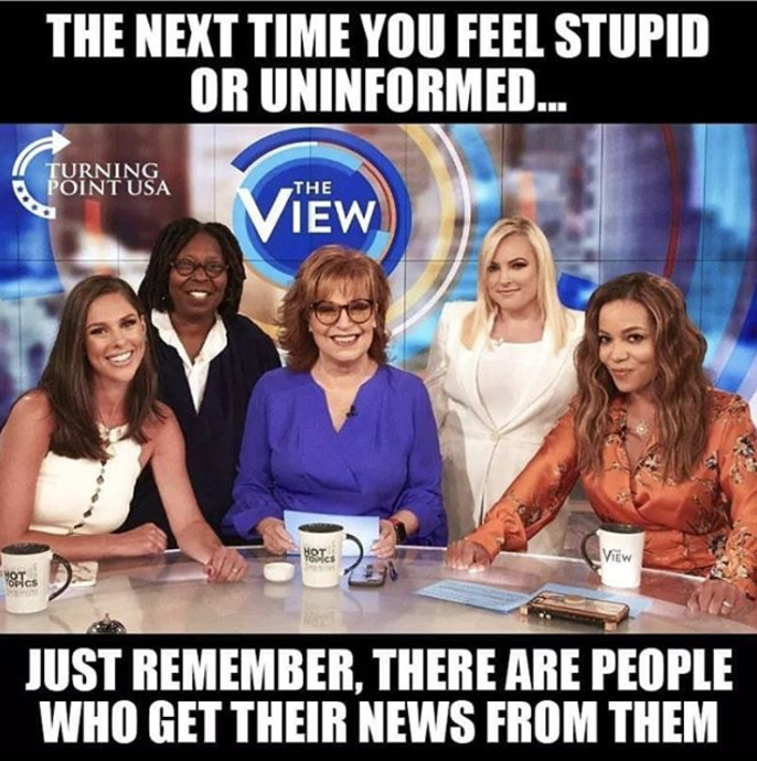 ...The View is just CNN and MSNBC by another name. It is the television version of the NYT and the WaPo, neither of which is a reputable news provider. Like Bill Maher's show, it is only about one thing now: destroy President Trump.