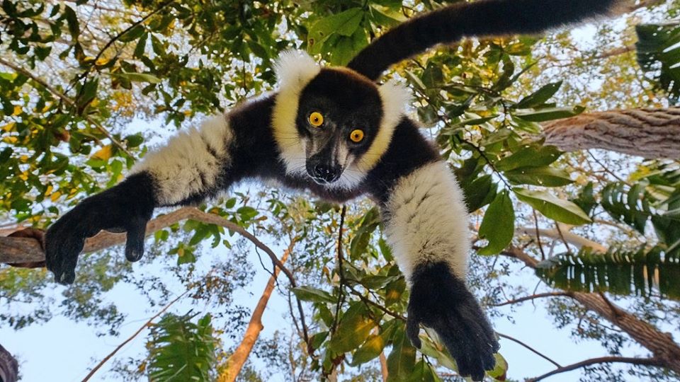 Luca Bracali, a wildlife photographer captured a hilarious moment in Madagascar Andasibe National Park when a black-and-white ruffed lemur tried to drop down from a tree to grab the photographer's camera.