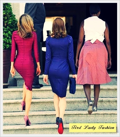 Here's the former First Buffarilla wearing something that looks like it was bought off-the-rack at Wal-Mart, was in a wad in her suitcase for 5,000 miles, and she threw it right on for this diplomatic event. Also, the various bows on this thing look stupid. Putting this skiff on a glamour magazine cover is like putting Michael Moore on one.