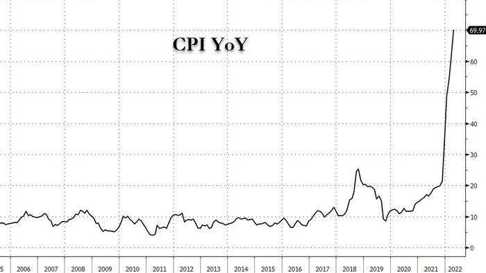 While both numbers are ridiculous, what is even more ridiculous is that until recently the central bank was cutting rates to avoid angering the president whose “Erdoganomics” theory of upside down economics recommends cutting rates when inflation rises, effectively setting the country on a path to suicide, something the Turkish lira has clearly grasped, as it has resumed plunging after cratering in 2021 and only a massive intervention by the central bank preventing an all-out economic collapse.