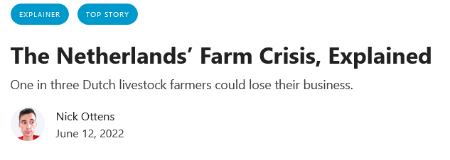 I’ll do my best to explain both the narrow issue of nitrogen pollution and the broader story of animal farming. Along the way, I’ll review the arguments farmers have made against reductions and I’ll end on the political implications for Rutte’s coalition.