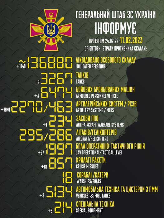 "UA MoD hit an all time (daily) high with claimed Liquidated Personnel (1,140 Russian KIA in a single day)). I do not necessarily trust the numbers, but they are a good (relative) indicator if losses are high or low for the previous day."