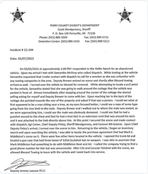 Now the Mail has more documents that they obtained from the sheriff in the matter that reveals that the initial report was incorrect — that indeed there was a shotgun found — 30 feet away from Middleton’s body. There are also more details about Middleton’s death from Perry Sheriff Scott Montgomery.