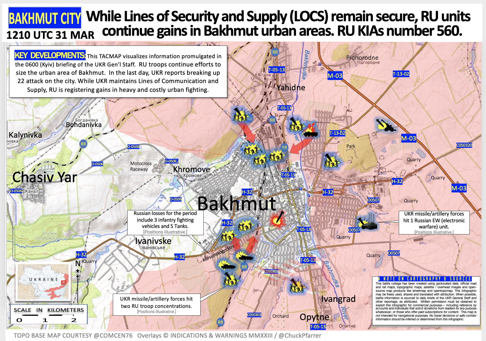 "BAKHMUT CITY /1210 UTC 31 MAR/ RU continues efforts to size the urban area of Bakhmut. In the last 24 hrs, UKR reports breaking up >22 attacks on the city. At present, UKR Lines of Communication and Supply (LOCS) are secure, but RU is registering gains in costly urban fighting."