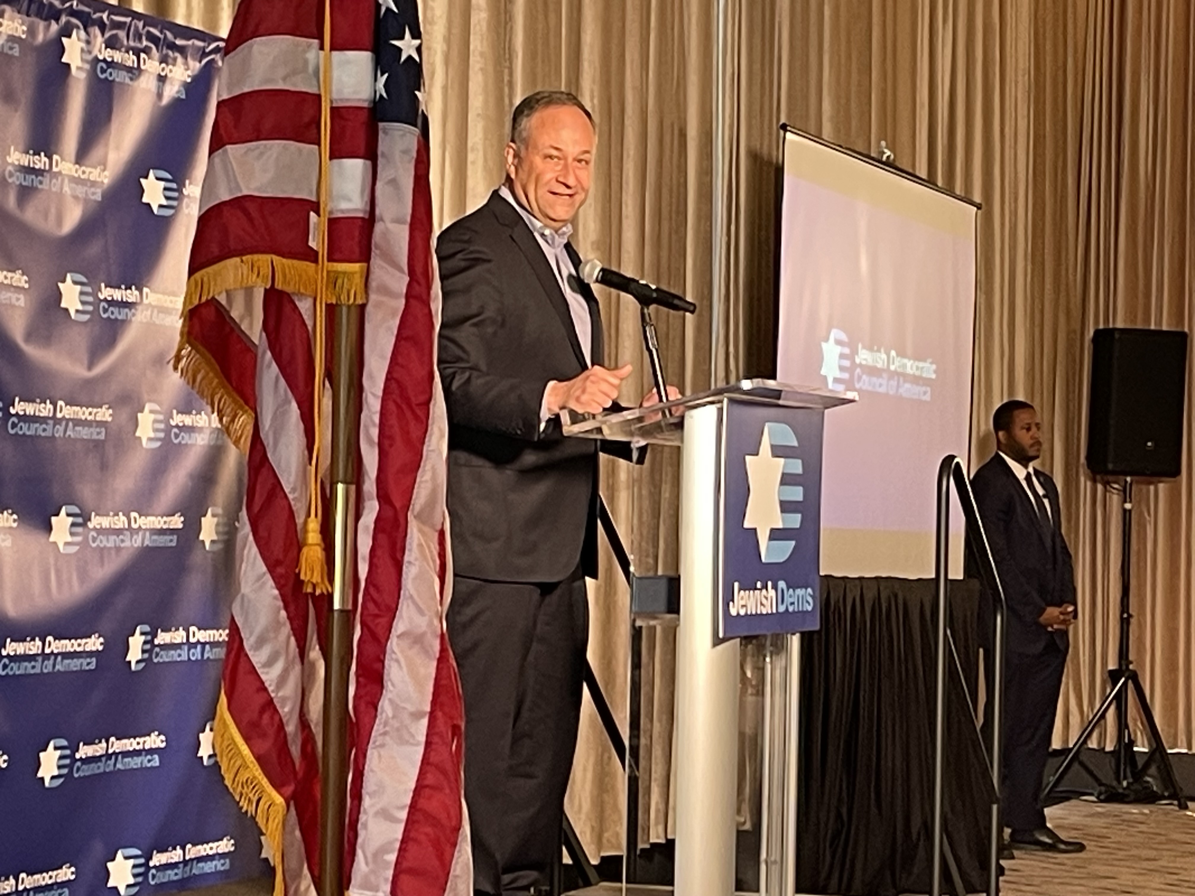 Speaking at a dinner hosted by the Jewish Democratic Council of America’s leadership in Washington, D.C., Douglas Emhoff, the Jewish husband of Vice President Kamala Harris, thanked the group’s board for leading the fight against antisemitism and standing up for America’s democracy.