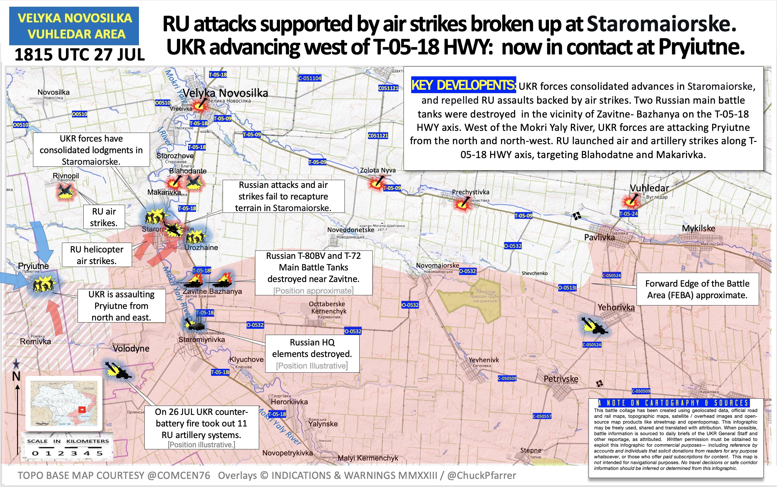 VELYKA NOVSILKA /1815 UTC 27 JUL/ UKR forces consolidated advances in Staromaiorske and repelled RU assaults backed by air strikes. Two Russian main battle tanks were destroyed in the vicinity of Zavitne- Bazhanya on the T-05-18 HWY axis.