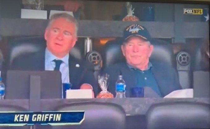 Today in Arlington, Texas during the #Cowboys vs #Giants football game, @RonDeSantis mega donor Ken Griffin was spotted next to George W Bush.