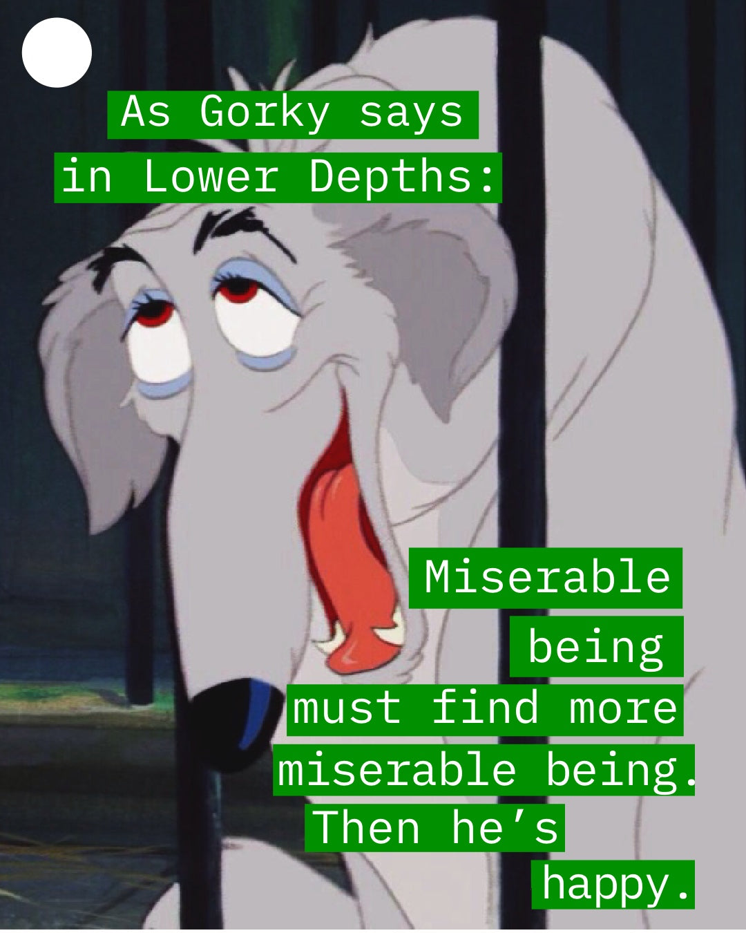 I saw “The Lower Depths” performed at my college. It was the most miserable experience. Like “Crime and Punishment” without redemption and deep insight. The next play the troupe performed was “Who’s Afraid of Virginia Woolf”, which was a light hearted, uplifting comedy by comparison.