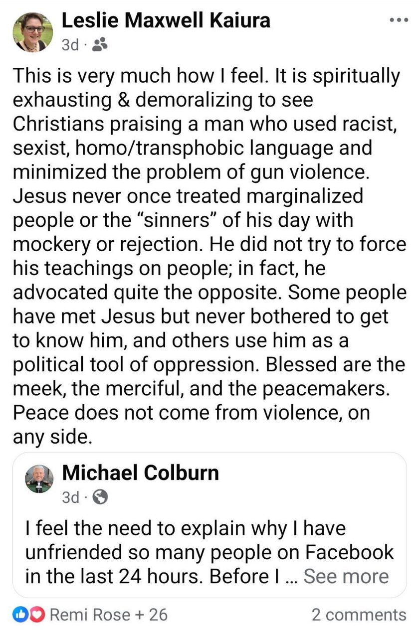 "It is spiritually exhausting and demoralizing to see Christians praising a man who used racist, sexist, homo/transphobic language and minimized the problem of gun violence," she wrote. "Jesus never treated the marginalized people or the 'sinners' of his day with mockery or rejection."